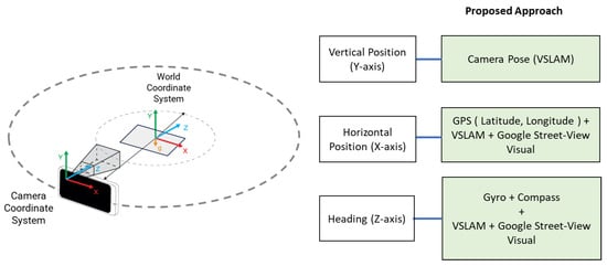 The outdoor position and localization of LAR depend on three parameters: the horizontal position (X-axis), the vertical position (Y-axis), and the heading of the user’s device (Z-axis) [46,47]. The horizontal position refers to the device’s latitude and longitude coordinates on the Earth’s surface. The vertical position refers to the height or the elevation of the device above the reference point, typically the ground level. The heading refers to the orientation or direction in which the device is pointing.
