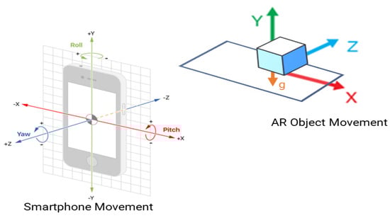 The 6DOF tracking includes movements in three translational axes (X, Y, and Z) and three rotational axes (roll, pitch, and yaw), allowing intuitive and precise application controls via smartphone movements [48,49]. When the user moves the smartphone, the IMU sensors (accelerometer and gyroscope) capture the movement and convert the data into real-world spatial coordinates (Y, X, Z) in real-time. This mapping process involves detecting the surface of the physical environment using the VSLAM module, which acts as a reference plane or an anchor for the virtual object. Contact detections with the real-world surface help constrain the movement of the anchored AR object, ensuring it aligns accurately with the user’s environment.