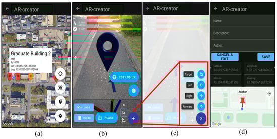 The prototype of the proposed authoring tool is implemented to offer an intuitive user experience for creating and managing AR objects in outdoor LAR navigation scenarios. When users launch the application, the initial interface presents a map view displaying all points of interest (POIs) that contain existing AR objects, which are retrieved from a centralized database. This map-based interaction provides users with a clear overview of the AR-enhanced locations around them. Users are provided the option to either view and interact with available AR objects at a particular POI or to add a new POI with AR content (Figure 7a).
