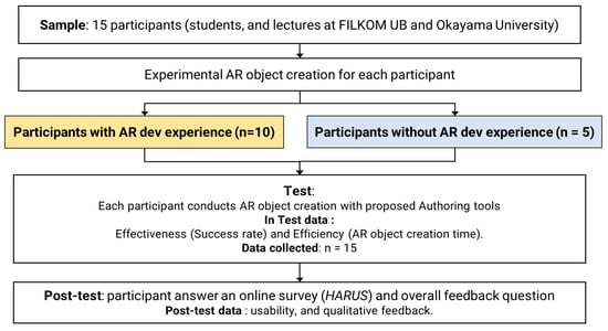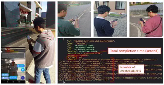 The participants were categorized into two groups: Group A (experienced developers) and Group B (novices). Group A consisted of ten participants aged 22–35, with more than 3 years of experiences in AR development. Group B included five participants aged 21–30, with less than 1 year experience in AR development. Following an introductory session, each participant was given 10 min to complete the task scenarios with the tool’s interface and functionalities in a controlled outdoor environment. Descriptive statistics were employed to analyze the data, providing insights into the effectiveness of the proposed tool for creating AR objects. The success rate and the completion time were used as the performance metrics to evaluate the system. After completing all the tasks, the participants filled out a post-study questionnaire to assess the overall usability of the proposed authoring tool. The experimental design flow is depicted in Figure 9.