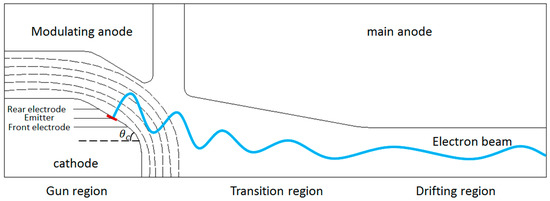 In the gun region, the emitter potential was identical for the rear electrode and front electrode, and the potential difference between the cathode and modulating anode caused a strong E-field to exist on the cathode surface. The E-field on the cathode surface was exactly perpendicular to the emitter and could be decomposed into and by refined optimization, resulting in the velocity of electrons emitted from the cathode being decomposed into and .