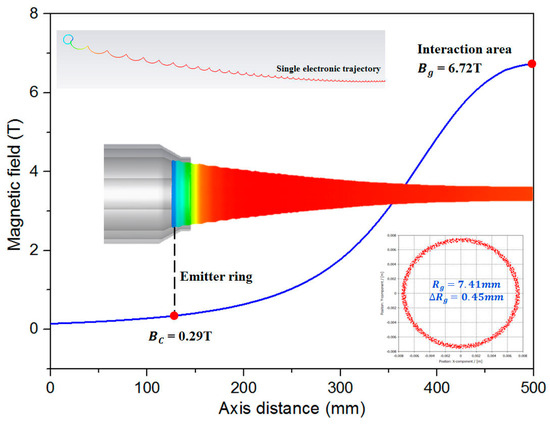 It is convenient to calculate the correlation between the guiding center radius of electron and the M-field intensity along the axial, where and are the M-field intensity and guiding center radius at the position of resonator, and and are the M-field intensity and guiding center radius at the position of the emitter. Therefore, according to the guiding center radius of the electron beam in the interaction resonator and the M-field distribution of superconducting magnet, the radius of emitter can be determined.