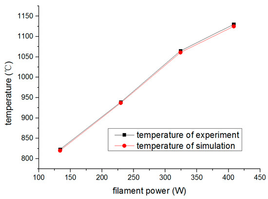 In the experiment, we changed the filament power in the range of 90 W–450 W by adjusting the filament supply voltage and current, and observed and recorded corresponding electrode temperature data shown in Table 2.