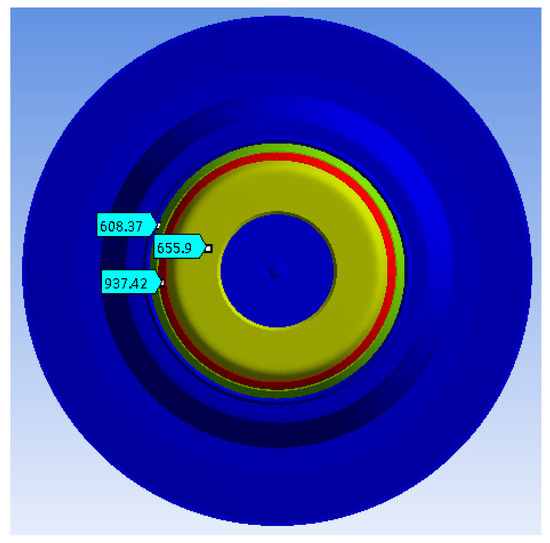 Figure 6 displays the temperature distribution of the MIG front view under a filament power of 220 W, where the temperature of the cathode surface is 937 °C (red ring). Because we employed a structure with superior thermal insulation capability, the temperature of the adjoining electrode showed obvious distinction, while the temperature of the front electrode was 655.9 °C and the temperature of the rear electrode was 608 °C. In practice, electron emission may cause the cathode surface temperature to decrease by approximately 3 °C per A/cm2 of emission current density, meaning the cathode surface temperature in the operating gyrotron will be approximately 12 °C lower than the simulated value. This gap was ignored in the thermal deformation simulation as it is a subtle effect.