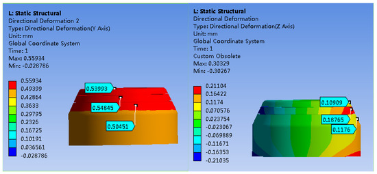 Based on the above model and results, the electrode geometric deformation of a 170 GHz gyrotron MIG under the described operating conditions was simulated. The power of the gyrotron filament was set at 220 W while the accelerating voltage was 80 kV and the operating current was 40 A in the experiment; three electrode geometric deformations are shown in Figure 7. Under the influence of the thermal field, the cathode radius increased by 0.19 mm, equivalent to 0.53% of the original geometric dimensions, and the radial expansion dimensions of the front electrode and rear electrode were 0.11 mm and 0.12 mm due to their lower temperature under the operating state. At the same time, because the MIG component was welded to the tube body, these three electrodes expanded approximately 0.548 mm in the axial direction towards the cavity. The temperature of the modulating anode rose less than 10 °C and the geometric deformation caused by the thermal field was less than 0.01 mm. The simulated values of the electrodes’ deformation are listed in Table 3.