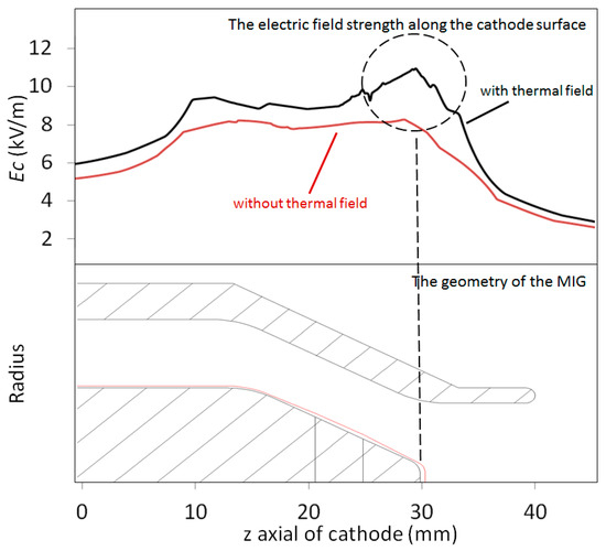 The lower part shows the MIG electrode outline operating with (red line)/without (black line) the thermal field, and the upper part shows the magnetic field distribution along the cathode surface in the corresponding area.