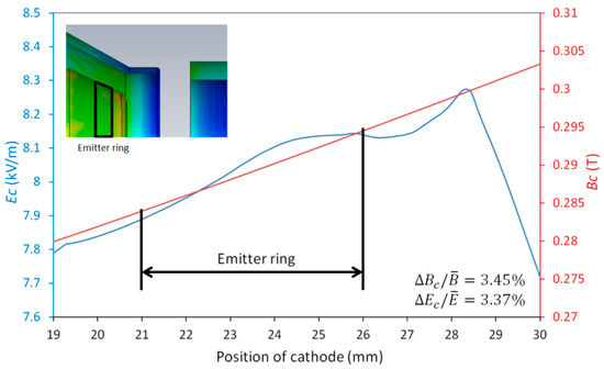 To eliminate the influence of geometric deformation on the performance of the electron beam under the thermal field, practicability must be considered. Therefore, an optimized scheme of a triode–anode MIG was designed. The E-field distribution between the cathode and anode was adjusted by changing the configuration of three anodes, while decreasing the voltage of the modulating anode to suppress the peak E-field of the front electrode. The E-field and M-field of the cathode surface were analyzed and are shown in Figure 9, in which the abscissa is the cathode position along the z-axis, the blue curve represents the E-field intensity on the cathode surface, and the red one represents the M-field strength at the axis of the MIG. At the emitter area, where the longitudinal length was 5 mm, the gradient of the E-field and the gradient of the M-field , an electromagnetic field match was perfectly achieved.