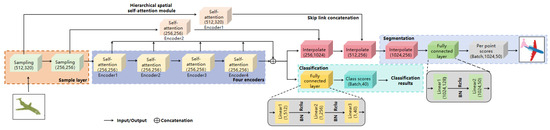 The hierarchical spatial self-attention module was introduced to address the issue that existing studies often ignore the spatial relationships between points. We adopted two encoders with self-attention to capture the spatial relationships of each point from two sampling layers, and the outputs are connected to the segmentation network via skip links.
