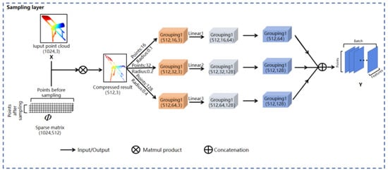 The sampling layer is designed to sample points from the point cloud efficiently and effectively. The sampling scheme used in PointNet [] can obtain sampled points quickly through random sampling. However, this strategy may not sample the point cloud uniformly, leading to information loss. The FPS strategy, adopted in [,], samples informative points by iteratively selecting the point farthest from the already selected points. Although this approach works well, its computational complexity boosts as the quantity of points grows. To address this issue, we adopted compressed sensing theory in the proposed sampling layer for more efficient sampling. As is well known, compressed sensing allows signal compression during the sampling process, enabling the acquisition of samples at rates significantly below the Nyquist rate while still ensuring the lossless reconstruction of the signal. By leveraging this property, the points sampled from the proposed layer can retain as much information as possible from the original point cloud.