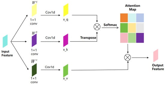 where the K, Q, and V are the generated features vector of the sampling layer, is the transpose, and is the point number. The process of the self-attention mechanism is shown in Figure 4.