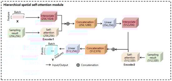 In previous works [,], the local and global features of the point cloud were directly connected to sub-network of segmentation via skip links. These skip links preserve features from earlier layers and transfer gradients to the segmentation network, thus avoiding the problem of vanishing gradients. Moreover, skip links enable the fusion of multi-scale features, which is crucial for capturing spatial context at different scales. However, the simple concatenation of features from different layers assumes that all features are equally important for the task. This assumption makes it difficult to capture the spatial relationships between points and lacks an effective feature selection mechanism. In practice, segmentation tasks require capturing spatial information between points to improve accuracy. To alleviate this limitation, a hierarchical spatial self-attention module is proposed. This module replaces the simple skip links by adopting two self-attention encoders to capture the spatial relationships between points. The self-attention mechanism is helpful for capturing the most relevant features, providing a feature selection mechanism that generates weighted features from different sources. This is particularly beneficial for segmentation tasks, where spatial context and precise feature selection are critical.