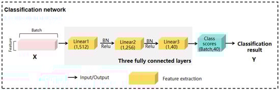 For the sub-tasks of classification and segmentation, two different network structures are implemented. For the classification task, we take the global feature (the X is shown in Figure 6) generated from the concatenation layer as the input, which is a 1 1024 feature vector, and then three fully connected layers (with the sizes of 512, 256, and 40, respectively) are connected for the final prediction (the Y is shown in Figure 6). This sub-network is shown in Figure 6.