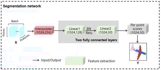 For the segmentation task, we take the output of the hierarchical spatial self-attention module as the input (the X is shown in Figure 7), which is a feature vector of size 512 256, and then interpolated to the size of 1024 256. Finally, two fully connected layers (of sizes 128 and 50, respectively) are connected for predicting the category of each point (which is the segment result represented by Y in Figure 7). The sub-network is shown in Figure 7.