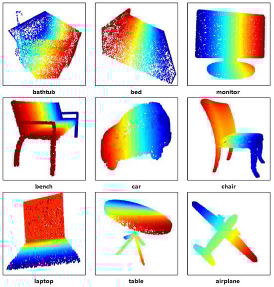 The experiments of classification are tested on the benchmark ModelNet40 [], which is a public dataset comprising 40 categories of CAD models, with each model containing 10,000 points that include x, y, z coordinates and normal vector information. The dataset includes 12,311 samples, and training and testing sets are divided into 9843 and 2468 samples, respectively, demonstrating considerable scale. This dataset is always used for the validation of point cloud analysis approaches. Figure 8 illustrates a part of the examples in the ModelNet40 [] dataset, such as bathtub, bed, monitor, bench, car, chair, laptops, table and airplane.