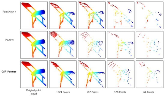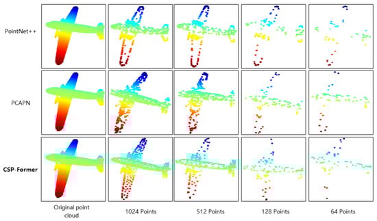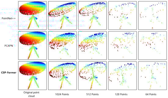 It is essential to evaluate the coverage of the sampling scheme [], which indicates if a point cloud can be accurately represented with a small number of points. We conducted visualization experiments comparing three sampling techniques: FPS, PCA sampling, and the proposed method. We selected CAD models from the ModelNet40 [] dataset, including point cloud samples of a chair, airplane, and table for testing. In the experiment, the point cloud samples were down-sampled to 1024, 512, 128, and 64 points, respectively. The evaluation is based on subjective results: If a smaller number of sampled points still allows the object to be easily identified (i.e., the point cloud retains a sharp outline), it indicates that the sampling method has preserved more of the original point cloud information and can roughly replace the original point set.