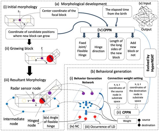 We propose that the radar, intermediate, and hinge nodes are situated in the input, intermediate, and output layers of the behavioral generation network, respectively. For example, in the network illustrated in (b-i), there are two radar sensor nodes (input layer), seven intermediate nodes (intermediate layer), and three nodes in the output layer: one hinge node, one NC node, and one LD node. Connections are established among the nodes across the input–intermediate, intermediate–output, and input–output layers. Each connection has its own weight, determined by the genotype CPPN, which receives the coordinates of the source and destination node pairs within the substrate space. Nodes in the output layer provide various outputs, including hinge angles (b-v), the timing of lifetime development (LD) events (i.e., identifying when developmental changes occur) (b-iii), and NC strategies (i.e., decisions on whether to place objects and at which timesteps) (b-iv). Consequently, the behavioral generation network can produce (1) diverse behavioral patterns in the creature, (2) evolve NC behavior, and (3) evolve lifetime developmental events according to the sensory input received from the radars.