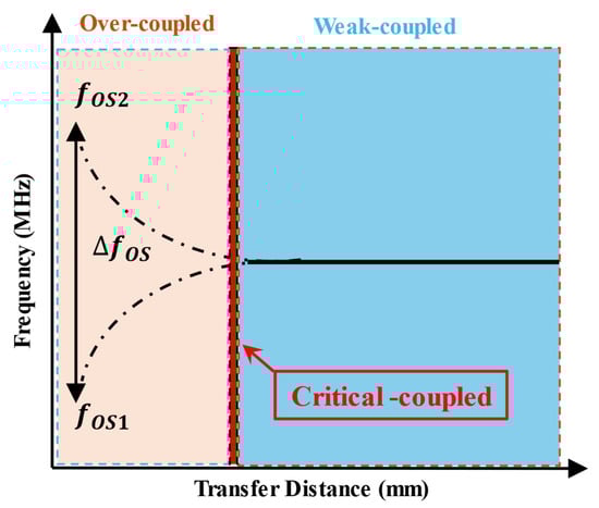 where is the resonance frequency with no load, is the coupling coefficient of inductive system, and is the loss constant. When the coupling coefficient (k) is lower than the critical coefficient value, the system operates within the weak coupling region. However, if k surpasses this critical threshold, the system transitions into an over-coupling region. In the over-coupled region, the frequency deviates by approximately ±20%. To improve power efficiency, a dynamic response in WPT systems has recently been achieved using non-linearity parity–time (PT) symmetry circuits, offering improved performance regardless of the variation in transfer distance between the Tx and Rx [].