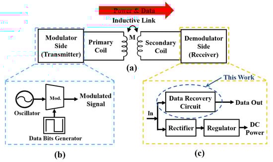 Typical block diagram wireless power and data transfer over inductive coupled link utilizing ASK-OOK modulation. (a) Inductive coupled link; (b) transmitter end for modulation; (c) receiver end for data and power recovery.