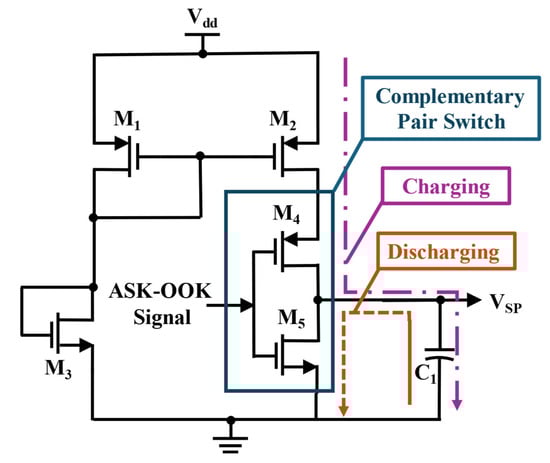 A complementary pair of NMOS (M5) and PMOS (M4) transistors is employed to charge and discharge the capacitor under specific biasing conditions. When the input voltage amplitude falls below the threshold voltage at the gate of NMOS transistor M5, PMOS transistor M4 conducts while M5 remains inactive. Consequently, current flows through M4, charging the capacitor (C1) at the output. Charging continues until the input voltage surpasses the gate threshold of M5, causing M4 to turn off and M5 to turn on, initiating capacitor discharge. During the positive cycle of the carrier signal, the capacitor discharges, and during the negative cycle, it charges. This alternating process results in the generation of an analog sawtooth peak signal VSP. The capacitor voltage can be written as