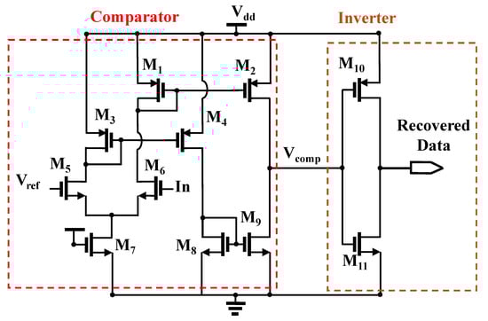 The circuit is divided into three stages. The differential input stage processes the input signal (In) and the reference voltage (Vref), where M5 receives Vref, and M6 handles the input signal, generating a small differential signal. The tail current source, formed by M7, provides a constant current through the differential pair. The intermediate stage amplifies the small voltage difference generated in the first stage. Transistors M3 and M4 constitute a current mirror load, converting the differential current into a corresponding voltage signal. In the push–pull output stage, when In > Vref, transistor M2 turns on, pulling Vcomp high, while for In < Vref, M2 turns off, enabling M4 to pull Vcomp low through M9. Finally, the inverter stage flips the polarity of Vcomp, producing the recovered data signal.
