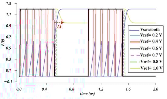 A push–pull comparator was used to detect the input signal and suppress minor VTC peaks, thereby generating a square waveform. A comprehensive parametric simulation was conducted to elucidate the delay in the comparator output relative to reference voltages. Upon analysis, we observed that higher Vref levels can affect the different reference voltages, highlighting corresponding operational delays with increasing reference voltage, as shown in Figure 7. Therefore, to achieve optimal performance, we maintained Vref = 0.6V for the comparator. An external reference voltage source was utilized to provide the reference voltage.