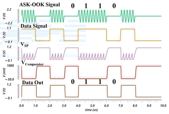 The inversion output stage, formed by transistors M10 and M11, plays a crucial role in processing the output of the comparator. This stage inverts and sharpens the signal, effectively converting the comparator’s analog output into a digital data signal, referred to as ‘Data Out.’ Figure 8 provides a detailed illustration of the signal processing flow within the system. It starts with the ASK-OOK modulated input signal delivered to the VTC, followed by the generated sawtooth waveform from the VTC. Subsequently, the comparator output waveform is shown, which reflects the intermediate signal prior to final processing. The figure concludes with the recovered ‘Data Out’ signal, demonstrating the overall data recovery mechanism employed by the circuit.