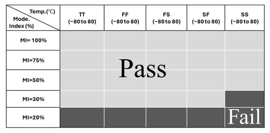 Furthermore, the proposed wideband DRC was thoroughly evaluated under a range of operating conditions, including variations in modulation indices, and environmental factors such as temperature fluctuations and process corners. This comprehensive analysis is essential for applications in wireless data transfer, particularly where data stability and recovery accuracy must be maintained across diverse conditions. As shown in Figure 9, a shmoo plot depicts the performance of the DRC, highlighting pass and fail conditions in data recovery across different test parameters. This plot effectively captures the circuit’s resilience and robustness, showing its responses across various process variations, temperature extremes, and data rate ranges, providing a detailed assessment of its suitability for demanding wireless data transfer applications. The pass/fail criteria are defined by the reliability of data recovery displayed at the output of circuit, as analyzed using Cadence Virtuoso. The design shows failure at a 20% Modulation Index (MI) across all corner conditions due to minimum difference between the high voltage level and low voltage signal. The circuit fails in the SS corner at 30% MI, primarily due to significant output delay.