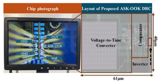 Fabricated chip micrograph (left) and layout (right) of the proposed ASK-OOK data recovery circuit with layout.