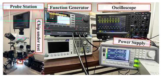 The data recovery circuit was fabricated using 180 nm CMOS technology. The layout was designed in the Cadence Virtuoso environment. The resulting prototype incorporates measurement pads for precise testing and evaluation, as shown in Figure 10, which illustrates the fabricated CMOS chip layout. Two EYEPASS PROBES (AC version) were used for on-wafer probing. This circuit prototype has an active area of 2440 µm2. It operates at 1.4 V DC, drawing 37.2 µA of current and leading to a power dissipation of 52.08 µW. This dissipation is higher than the value reported in [], primarily due to the circuit’s broader carrier frequency range requirements.