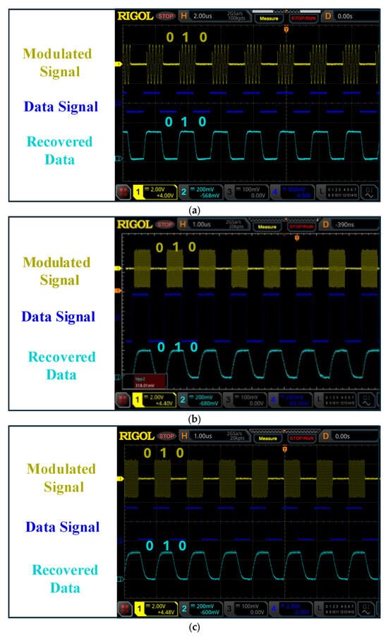 The OOK-modulated signal was generated using a multifunction generator with a data rate of 2 Mb/s. Figure 12a presents the results of the data recovery process for a 5 MHz carrier frequency. The top waveform (yellow) shows the 5 MHz modulated ASK/OOK signal, where amplitude variations encode the binary data. The middle waveform (blue) represents the original data signal, providing a reference for the intended binary sequence with high and low levels for binary ‘1’ and ‘0’, respectively. The bottom waveform (cyan) illustrates the recovered data, showing the output of the data recovery circuit, which accurately demodulates the signal and reconstructs the original data sequence. This confirms the circuit’s capability to retrieve data at 2 Mb/s using a 5 MHz carrier frequency.