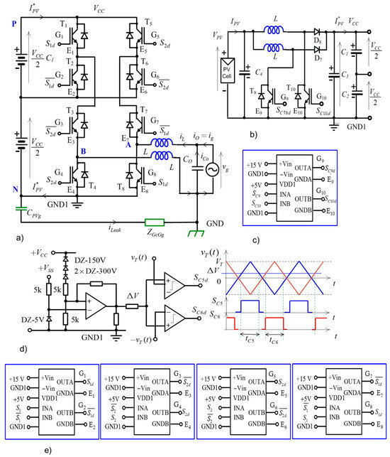 The S-PT inverter in CHB configuration: (a). Circuit diagram, (b). Generation of two half-supply voltages, (d). The principle of operation of the PWM modulator controlling the DC-DC two-phase boost converter (VCC = 380 V), (c,e). Block diagrams of the IGBT control system.