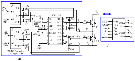 A combined gate control system has been designed to drive IGBTs both in experimental as well as in simulation tests with PSPICE. Figure 3a shows the implementation of an integrated gate drive circuit with galvanic isolation in the transmission path of the control signal for any IGBT of the inverter, as well as an isolated and floating bias power supply for the gate driver. Figure 3b shows its general block diagram with input and output voltages and signals. Fast dual-channel isolated MOSFET gate-driver 2EDF7175 ICs provide functional input-to-output isolation using coreless transformer technology. Each pair of inverter IGBTs is assigned to an individual two-channel gate control circuit.