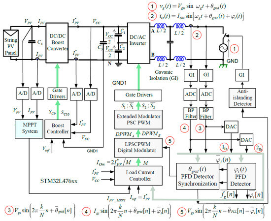 The main control blocks implemented outside the microprocessor are the development of the linearized PSCPWM modulator, gate drivers, and circuits matching the levels of measured signals to the inputs of A/D converters. The control blocks implemented inside the microprocessor are the MPPT system, linearized PSCPWM modulator, two DPWM boost controllers, software phase frequency detector (SPFD) of the phase angle between the voltage and current vectors, detection and synchronization unit based on the software phase-locked loop (SPLL), and dead-beat load current controller (power calculation unit). Individual blocks of the control system are widely described in the literature and are solved in many different ways [16,17,18,19,20,23,24,25,26,27].