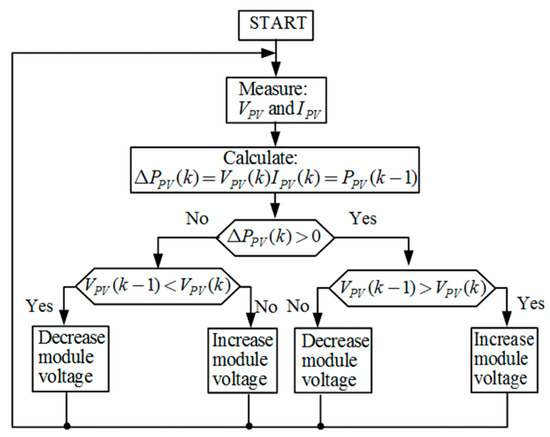 Figure 5 shows the block diagram of the P&O MPPT algorithm and its operation algorithm. At a given operating point, the MPPT measures the changes in the output power and voltage of the PV panel. The MPPT algorithm repeats cyclically until the maximum power point is reached, i.e., when dP/dV = 0.