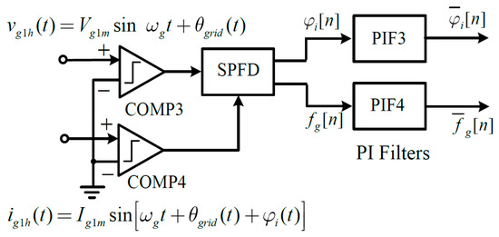 Figure 6 shows the measurement system of the phase angle between the grid voltage and load current vectors, as well as the grid voltage frequency , based on a software phase-frequency detector (SPFD) implemented on the STM32L476RGTx microcontroller.