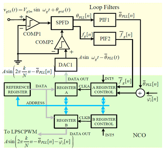 The SPLL generates in each grid period a modulating signal for the linearized PSCPWM digital modulator in the form of 1600 samples of nine-bit numerical sine wave, oversampled by twice the required sampling frequency at the switching frequency of 40 kHz, synchronous with the grid voltage, but shifted by the phase angle −( + ), ensuring reactive power compensation.