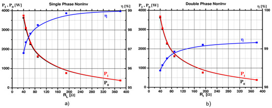The measured energy dependencies for various load resistances and the energy efficiencies of the S-PT inverter determined on their basis are presented in Table 1. The obtained results are comparable to those obtained in PSPICE simulations, which are presented in Figure 9.