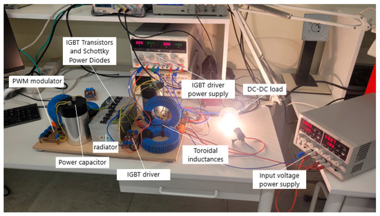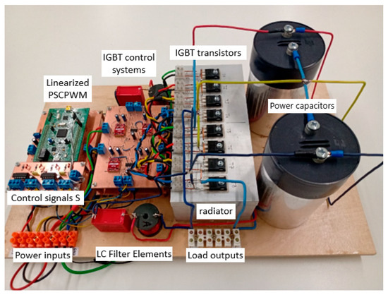 Figure 16 shows a photograph of the assembled S-PT inverter in three-level CHB configuration. Load resistance is connected to the inverter output via short cables from the outside.