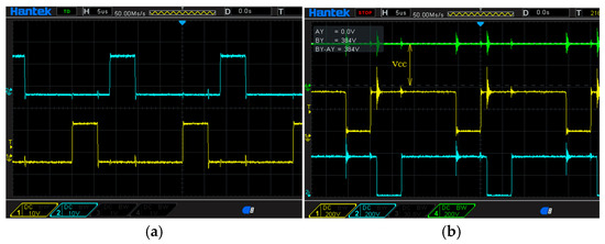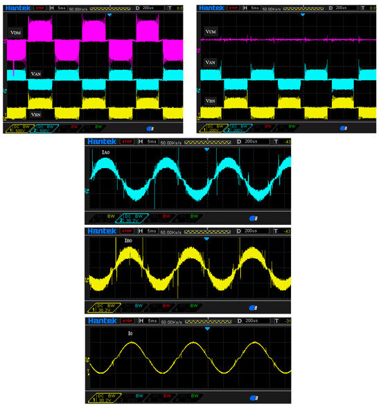 Figure 18 shows the measurement waveforms at the output of the S-PT inverter, measured at a DC-link voltage of VCC = 380 V, a switching frequency of 40 kHz, and a load resistance of RO = 64 Ω.