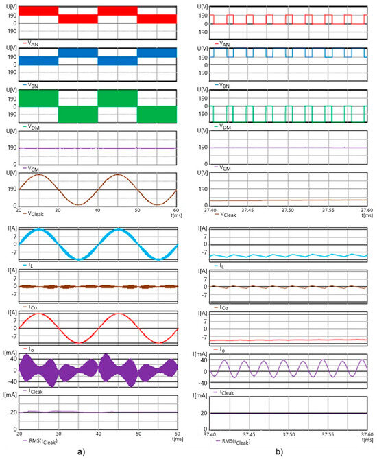Output voltages and currents of the S-PT inverter (a) and zoomed view of these voltages and currents (b) simulated in PSPICE. From top to bottom: VAN; VBN—complementary half output voltages at points A and B of the inverter, VDM; VCM—DMV and CMV differential and common voltages; voltage on the CPVg capacitance; iL—inductance current; iCo—current of the filter capacitor; iO—load current, iCleak—leakage current of CPVg; RMS of iCleak.