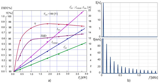 The energy efficiency (a) and THD characteristics (b) of the S-PT inverter in three-level CHB configuration: IOm—load current amplitude; IORMS—RMS of load current; IPV*—output current of the DC-DC two-phase boost converter.