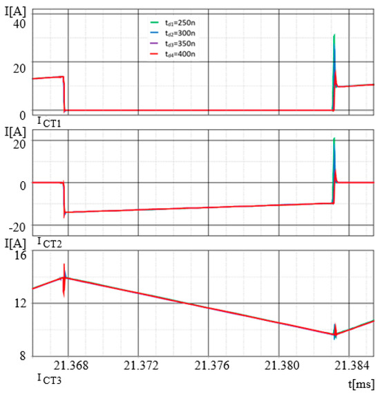 Figure 15 shows the time simulations of the IGBT collector currents, namely ICT1, ICT2, and ICT3, when switching a load current of approximately IO = 14 A in the selected switching period.