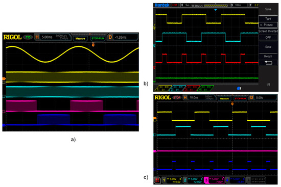 Figure 17a presents the following signals from top to bottom: Vm—grid voltage, PWMA, PWMB, S1, S2, generated in two grid voltage periods, while Figure 17b shows zoomed views of these signals in selected small fragments, respectively, for positive (b) and negative (c) half-periods. It can be seen that S1 = PWMA · PWMB and S2 = PWMA + PWMB, respectively.