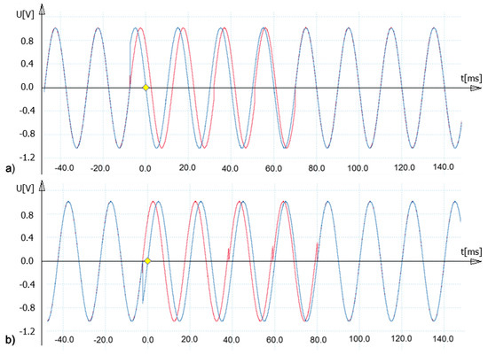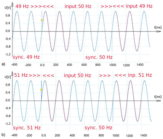 Oscillograms of the voltages generated at the output of the SPLL with a step frequency excitation from 49 Hz to 50 Hz (a) and from 50 Hz to 51 Hz (b).