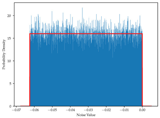 As an example, consider 100,000 samples taken from a Uniform[0, 1) distribution, also denoted as a distribution. Here, the floating-point samples can be considered infinite-precision; thus, . This signal is then quantized into four bits. If a truncation quantizer is used, then according to Equations (3), (4), (7), and (8), the noise distribution is . The results are shown in Figure 1. The red line represents the predicted distribution while the blue bars show the histogram from the MC simulation.