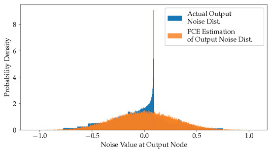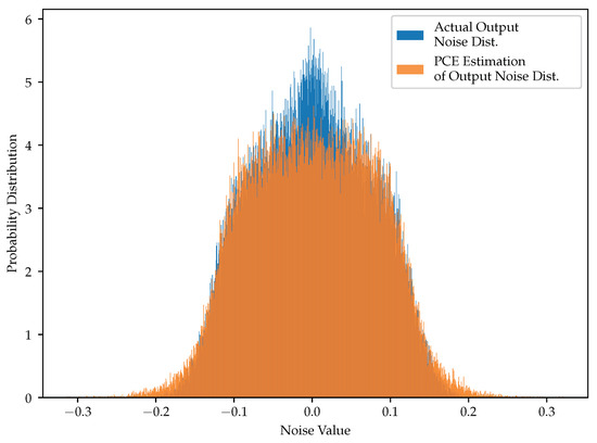 The idea behind PCE is shown using Equation (9). Here, the random variable z is decomposed into PCE coefficients, , and the orthogonal PCE basis functions, . Here, through is an independent standard random variable. The distribution choice for depends on how z is distributed. If z is uniformly distributed, it would make sense for to also denote a standard uniform distribution. On the other hand, z might be a random variable modeling a more complicated distribution, in which case, it might work better to have each have different distributions. The distribution choice influences how the polynomials, , are constructed: