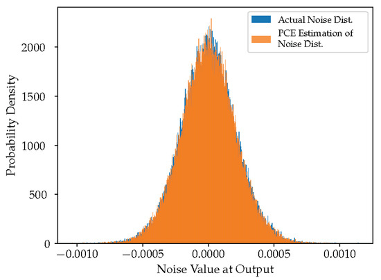 The PLL has two accumulating structures within it. As a result, a new variable needs to be injected for each PCE simulation time step to accurately model the system. Additionally, like in the IIR filter example, the PCE simulation must be run for a sufficient number of time steps for the output to converge to a final value. Experimentally, it has been observed that this convergence takes about 100 simulation time steps (Figure 19). Since the size of the basis polynomial set increases factorially with the number of random variables (Equation (21)), and the runtime of a multiplier exhibits a cubic dependency on the size of the basis set (Equation (28)), it is clear that 100 random variables cannot be supported. To address this issue, only one distribution with a time-varying mean is propagated. However, this is a big approximation, and the effects of such an estimation will be seen in later results.
