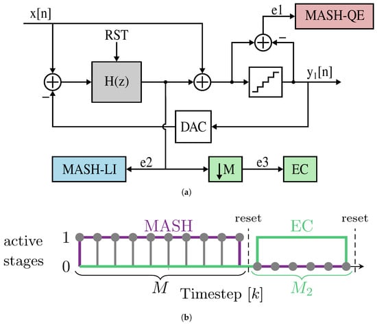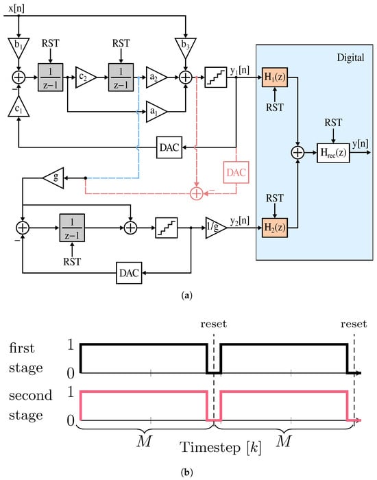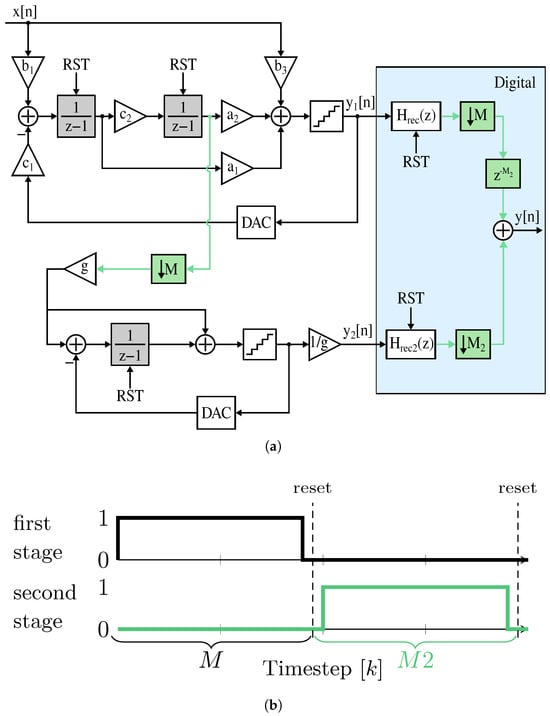 A similar effect appears in the EC architecture. There, the second stage requantizes the last integrator output (quantization error) of the last operation cycle M of the first stage. But this corresponds to the quantization error of two cycles before, which, if subtracted from the digital output of the first stage, would result in erroneous output. Thus, also in the case of EC, the two-clock cycle delay has to be accounted for. These result match with Equations (5), (7) and (8).
