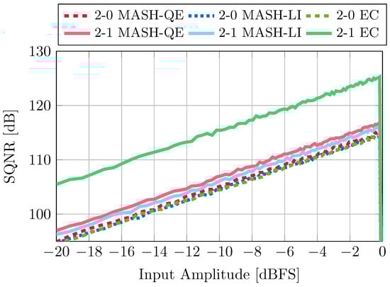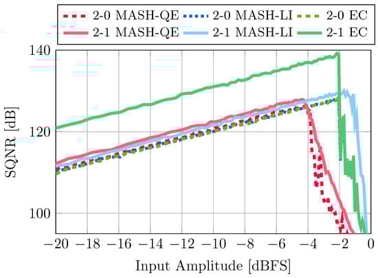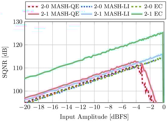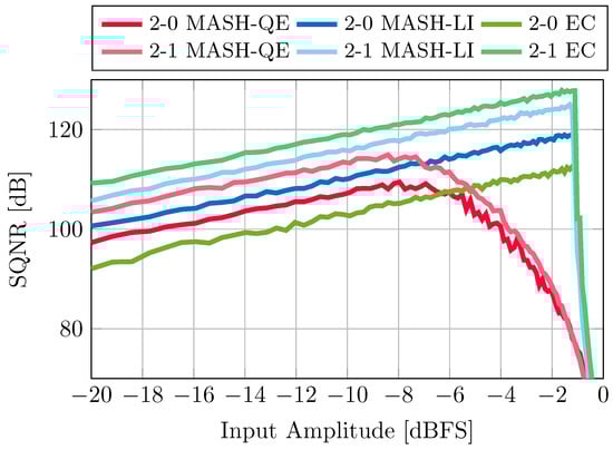 Figure 8 shows the simulated SQNR using the prior simulation conditions of Figure 5, but including an inter-stage gain . For lower input amplitudes, the SQNR of all employed architectures increases by . Only at large input amplitudes, we see differences, the reason for which can be explained: as discussed, the quantization error must be correctly extracted, which is not the case for large input signals for the MASH-QE due to the clipping of the adder output (quantizer input). Moreover, large input signals will still also increase the quantization error if extracted at the output of the last integrator. Thus, the inter-stage gain will start to slowly overload the second stage. Both EC variants and the 2-0 MASH-LI slightly lose MSA, as every overload of the second stage will heavily decrease the accuracy of the requantization and its subtraction from the overall output. Interestingly, the 2-1 MASH-LI loses the least performance. This is because even if the second stage first-order I-DSM is slightly overloaded, it still maintains a reasonably high SQNR.