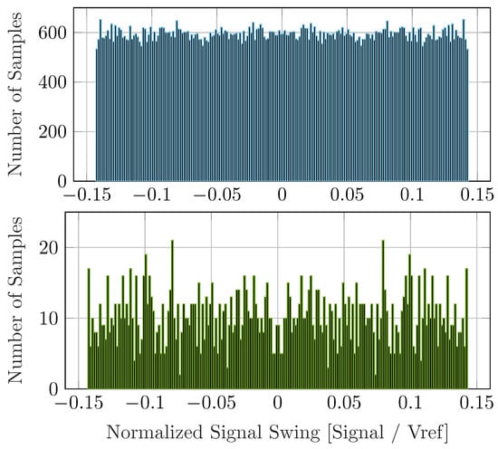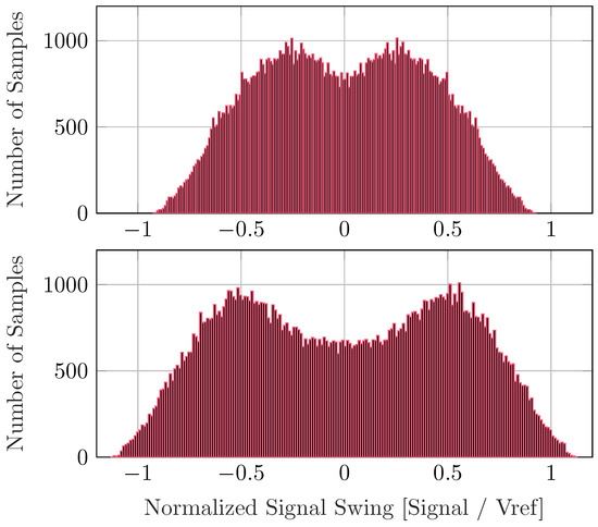 The simulated SQNR is shown in Figure 5. Unlike the ideal simulation in Figure 4, the MSA of the MASH-QE drops significantly. Close to the MSA, the quantizer input experiences the largest signal, slowly starting to overload the quantizer. While in a single-stage I-DSM, this usually yields a smooth reduction in SQNR and finally instability by overload, this is different in a multi-stage design. The adder preceding the quantizer experiences the largest output swing and will clip the large swings as the input signals increase. The MASH-LI and the EC architectures extract the first stage quantization error in the analog domain from the output of the last integrator, while the QE architecture relies on an exact extraction of the quantization error by a subtraction of the quantizer input (adder output) from the quantizer output. For illustration, Figure 6 shows the histogram of the adder output at an input signal of −6 dBFS and −3 dBFS, respectively. In comparison, the histogram of the last integrator output (relevant for MASH-LI) and the histogram of the last sample of the last integrator output (relevant for EC) are shown in Figure 7. While the adder output is still within a full-scale range (normalized to ) for the low input, the output of the adder increases above the full-scale range and will be chopped off by the limiter. Accordingly, the subtraction between the quantizer input and the quantizer output does not extract the correct quantization error for high inputs and leads to the performance degradation seen in Figure 5. In contrast, the output of the last integrator is limited to , defined by the employed three-bit quantizer in the first stage, which does not experience clipping. Thus correct requantization can be achieved for the MASH-LI and the EC architectures at large input signals.